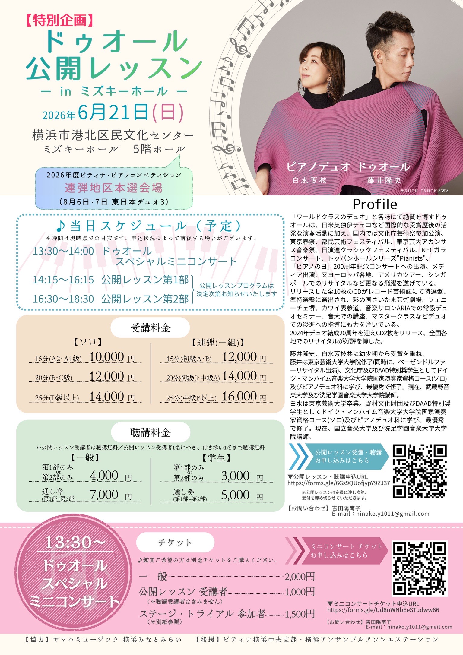 横浜市港北区民文化センターミズキーホールは、2026年度ピティナ·ピアノコンペティション「連弾地区本選会場」(8月6日·7日 東日本デュオ3)です。